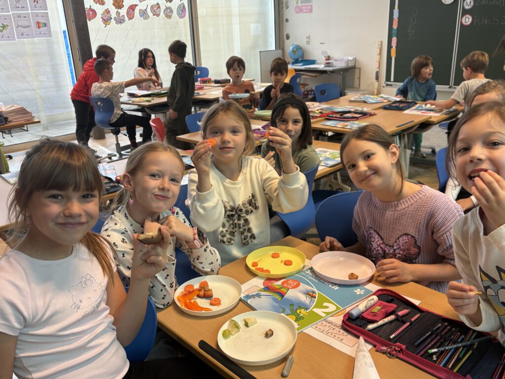 In Sachunterricht und Kunst lag der Fokus in der 2a auf dem Bauernhof, der Ernte und all dem Gemüse und Obst, das uns die Erde schenkt.