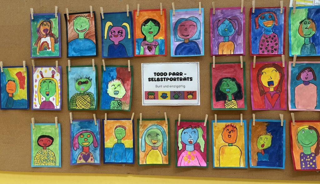 Die Kinder der 2a haben ihrer Kreativität bei den Selbstportraits, inspiriert von den Büchern von Todd Parr, freien Lauf gelassen.