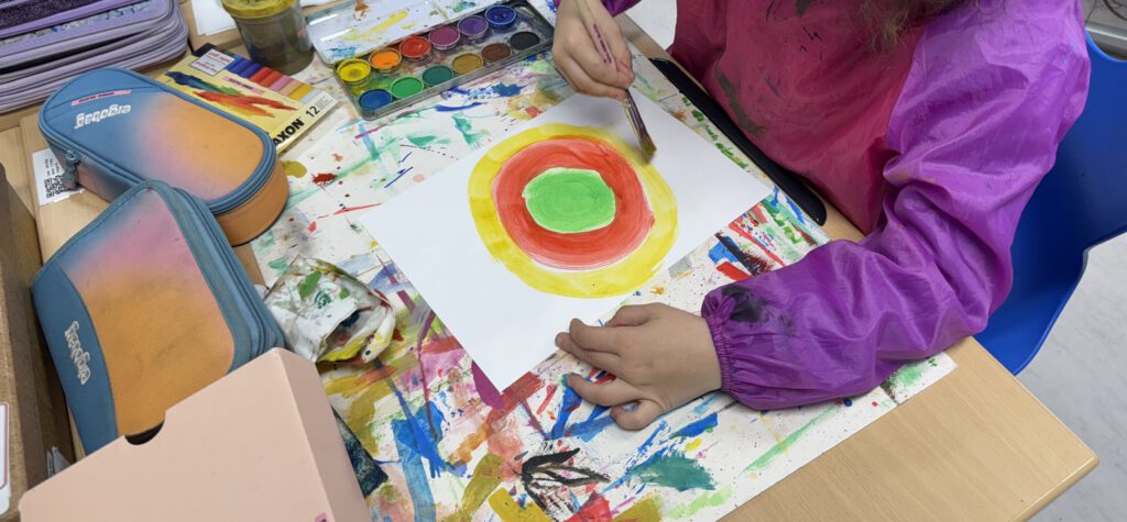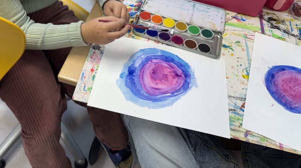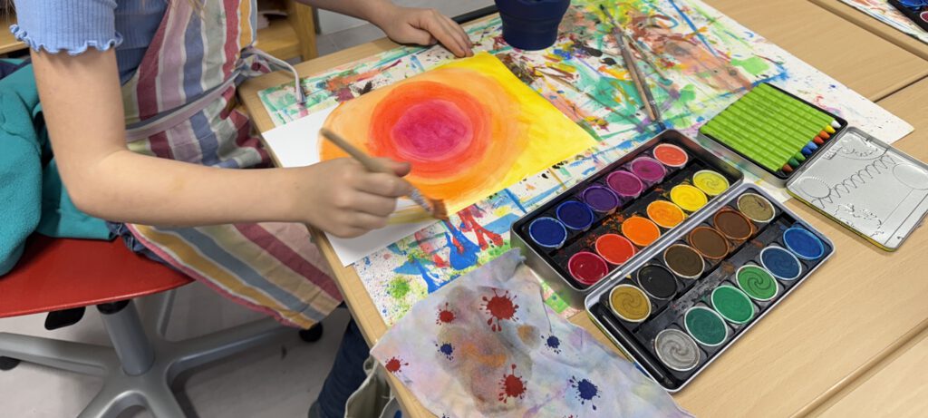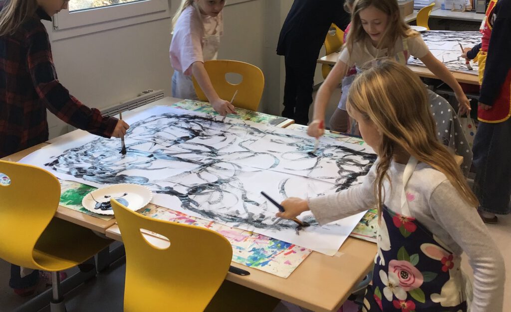 Im Rahmen des Atelierunterrichts nehmen zurzeit kreativ interessierte Kinder an der Fantasiewerkstatt teil. Dort wurde mit viel Neugier und noch mehr Freude gearbeitet – denn „nichts zu verschütten“ war ausdrücklich nicht erwünscht, und sauber bleiben musste man auch nur wenig. Die Pinsel durften tief in die Farbe tauchen.