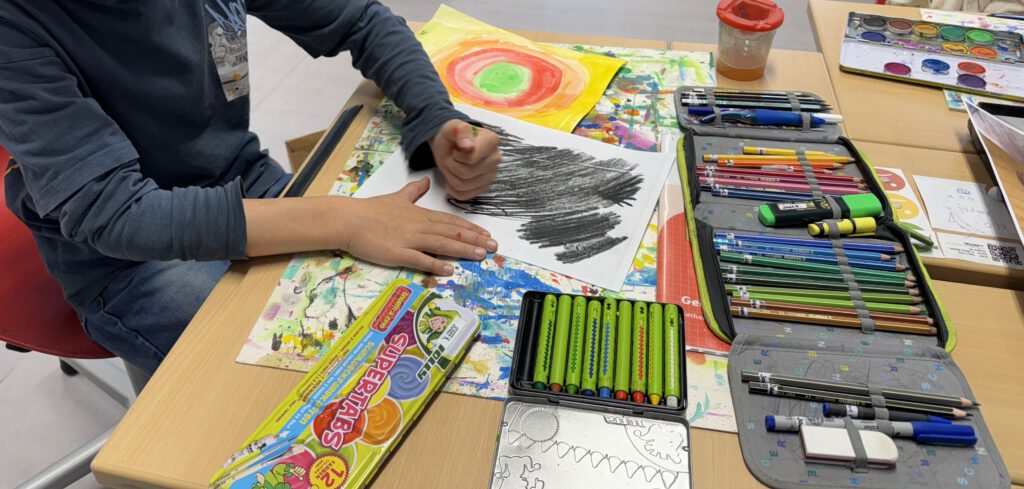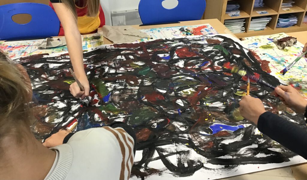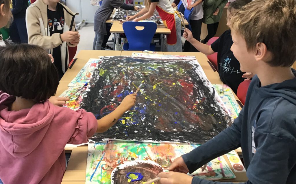 Zu Beginn wagten sich die Kinder an ein großformatiges, abstraktes Gemeinschaftsbild. Mit schwarzer Farbe und viel Bewegung bemalten sie ein riesiges Malpapier, begleitet von Musik, die den Rhythmus vorgab. Danach füllten sie die freien Flächen mit den drei Grundfarben. Durch das spontane Arbeiten entstanden spannende Farbmischungen und überraschende Effekte. Zum Schluss bekam jedes Bild einen selbstgewählten Titel.