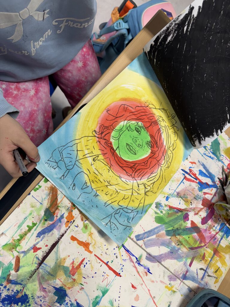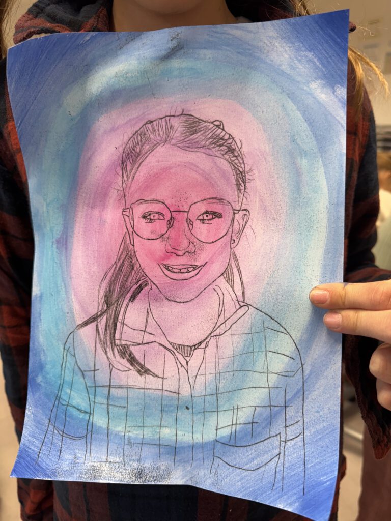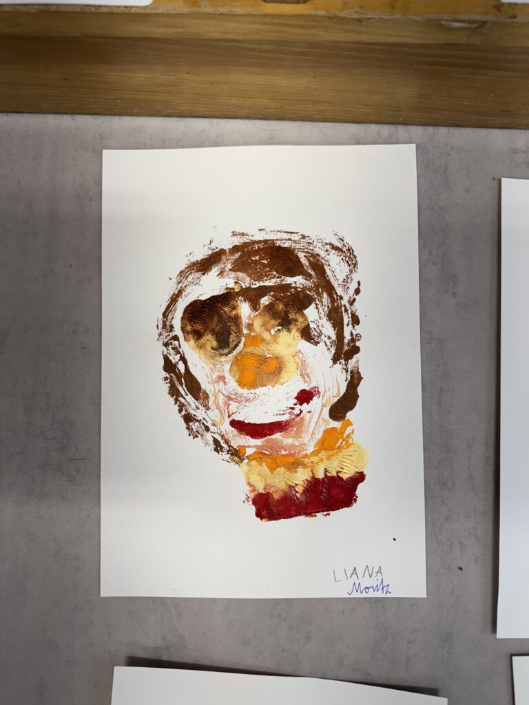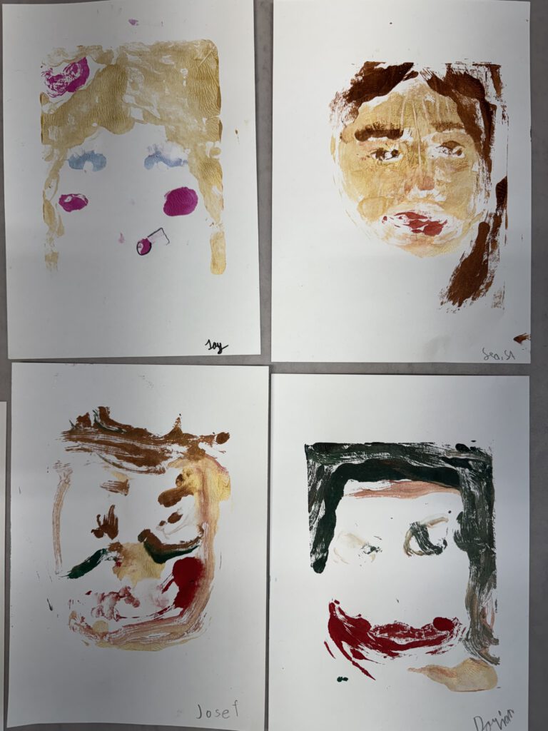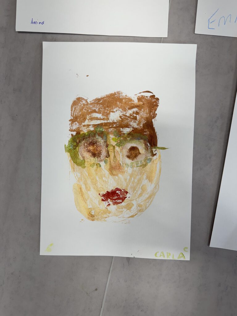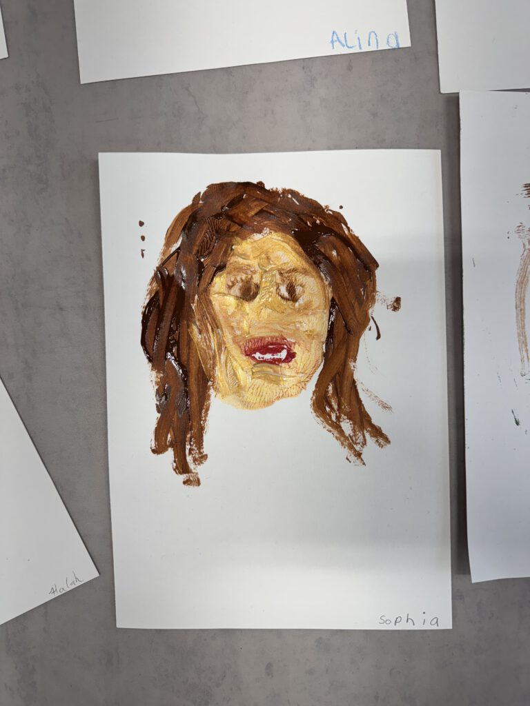 In einer weiteren Einheit ging es um Porträts. Mit einer Plexiglasscheibe vor dem Gesicht zeichneten die Kinder ihre eigenen Konturen nach – eine Übung, die genaues Hinschauen verlangte. Der anschließende Druck aufs Papier brachte abstrakte und manchmal wunderbar ungewöhnliche Formen hervor. Danach wurden die Porträts detailreicher, indem die vorher gezeichneten Linien auf einen bunten Wasserfarbenhintergrund mit Wachsmalkreiden abgepaust wurden. So entstanden kontrastreiche Arbeiten, die zeigen, wie vielfältig Kunst sein kann: mal genau, mal abstrakt, mal im Team und mal allein.