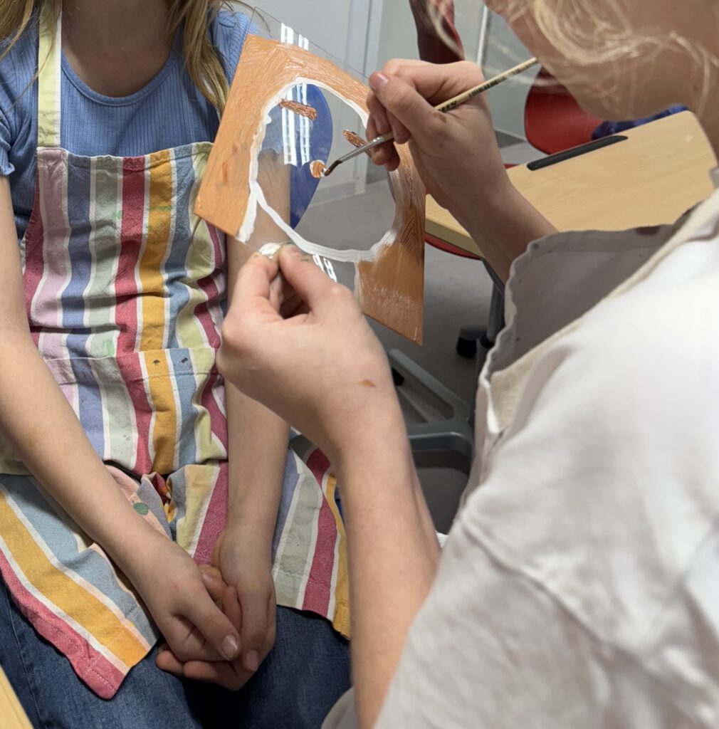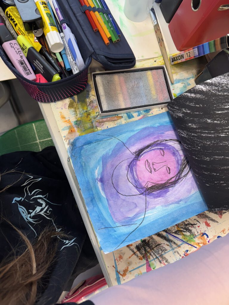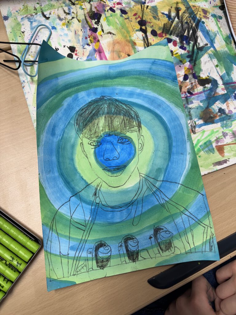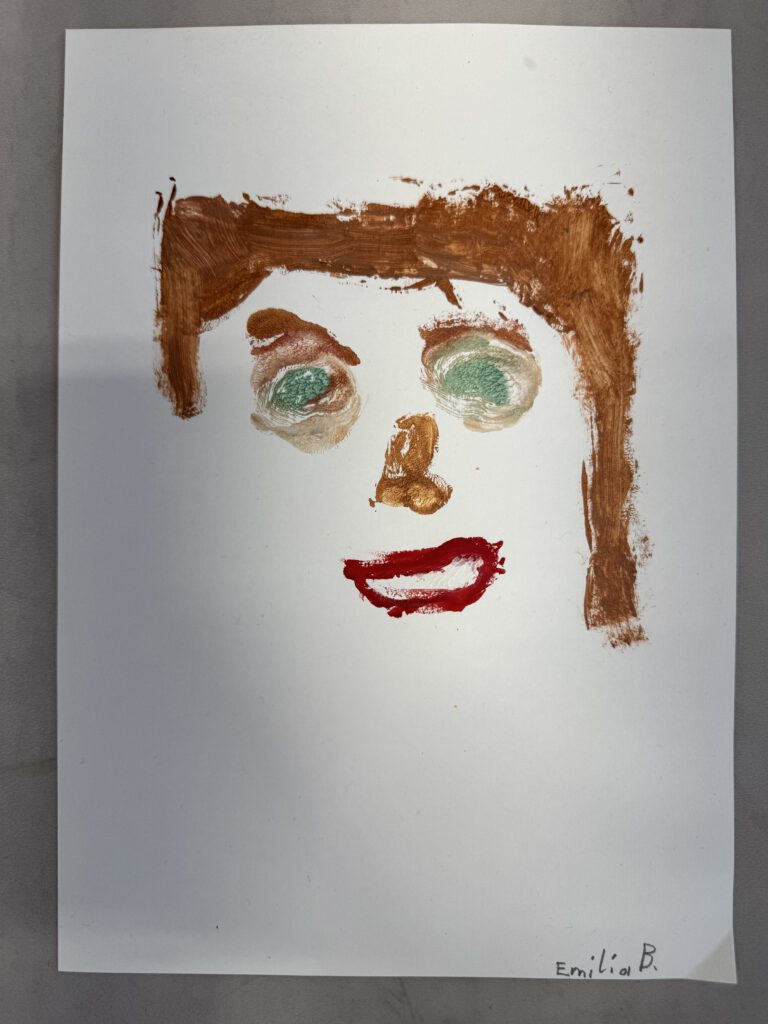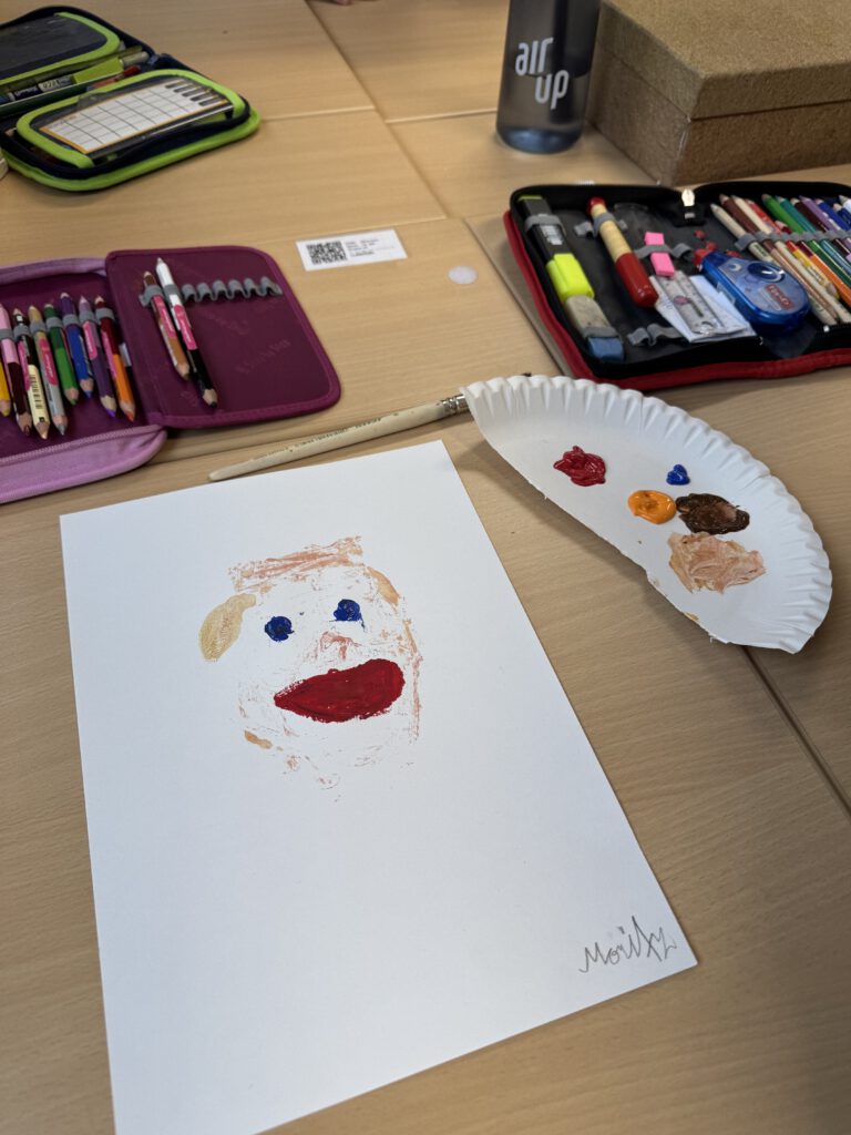 In einer weiteren Einheit ging es um Porträts. Mit einer Plexiglasscheibe vor dem Gesicht zeichneten die Kinder ihre eigenen Konturen nach – eine Übung, die genaues Hinschauen verlangte. Der anschließende Druck aufs Papier brachte abstrakte und manchmal wunderbar ungewöhnliche Formen hervor. Danach wurden die Porträts detailreicher, indem die vorher gezeichneten Linien auf einen bunten Wasserfarbenhintergrund mit Wachsmalkreiden abgepaust wurden. So entstanden kontrastreiche Arbeiten, die zeigen, wie vielfältig Kunst sein kann: mal genau, mal abstrakt, mal im Team und mal allein.