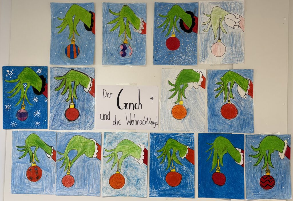 Im Kunstunterricht der 4B-Klasse setzten sich die Kinder mit dem Thema „Der Grinch und die Weihnachtskugel“auseinander. Als Motiv diente die bekannte grüne Grinch-Hand, die eine Christbaumkugel festhält oder stiehlt. Alle Bilder wurden frei Hand mit Ölkreiden gestaltet.